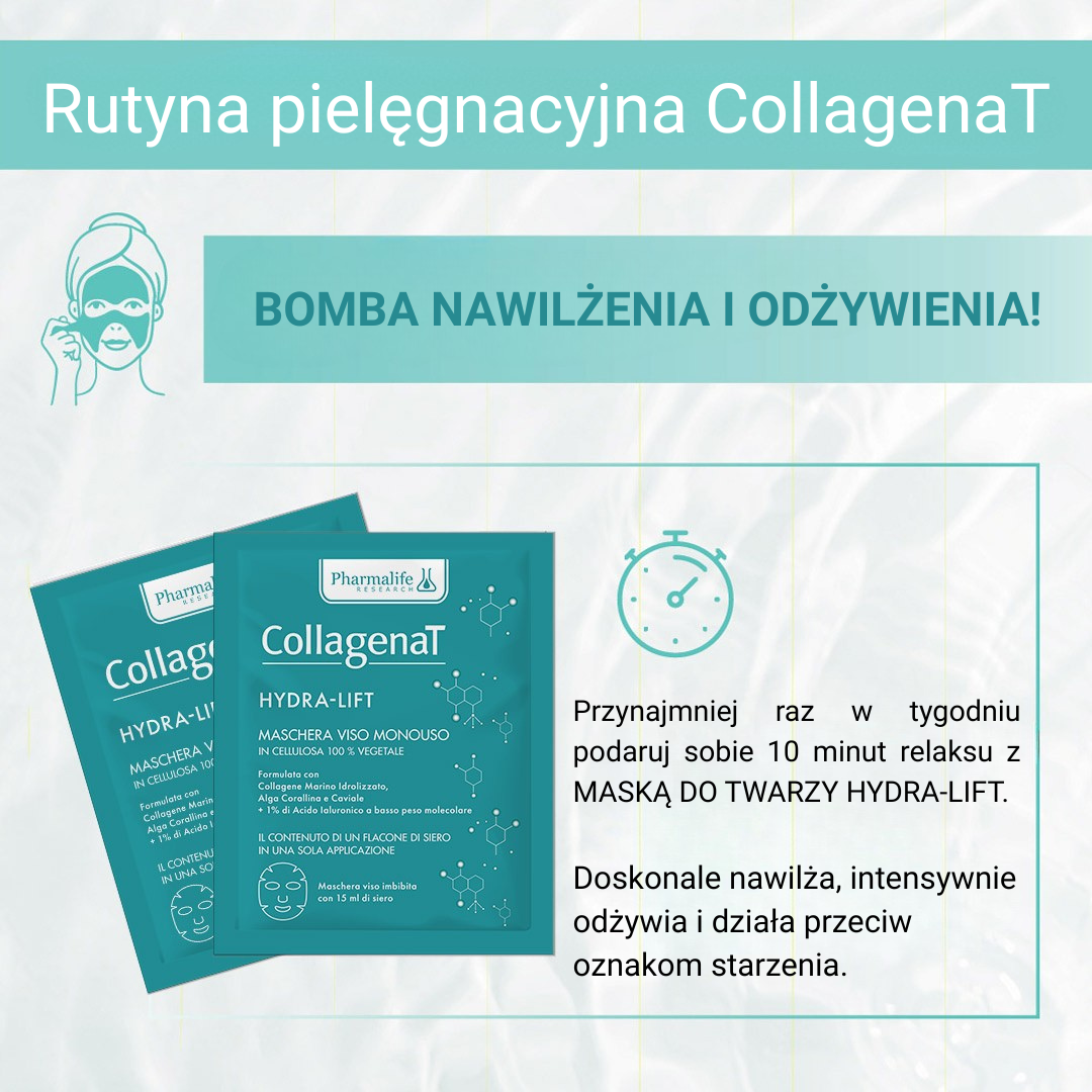 Collagenat Hydra-Lift to jednorazowa maska wykonana w 100% z naturalnej celulozy roślinnej, nasączona serum o działaniu dermoaktywnym, które natychmiast koi i regeneruje skórę. Dzięki skoncentrowanej formule bogatej w składniki aktywne, maska poprawia elastyczność skóry, wygładza drobne zmarszczki i przywraca jej zdrowy blask. Doskonale sprawdzi się w pielęgnacji każdego rodzaju skóry.