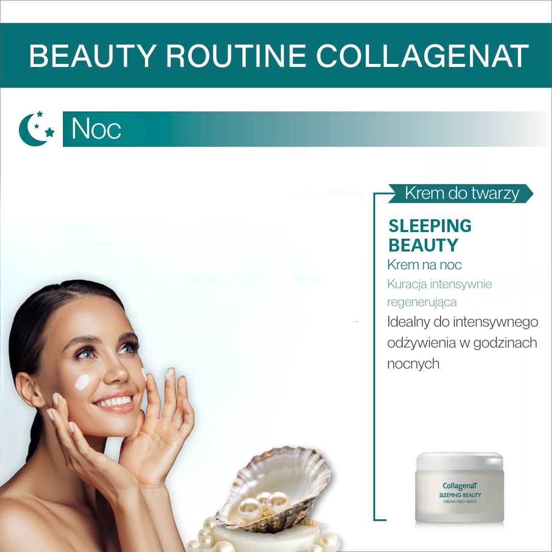 Otul skórę nocną kuracją, która intensywnie regeneruje, nawilża i odżywia cerę, gdy Ty śpisz. Collagenat Sleeping Beauty to krem na noc stworzony z myślą o skórze wymagającej, która potrzebuje głębokiej odbudowy i ukojenia. Dzięki formule bogatej w składniki aktywne, krem zapewnia jędrność i nawilżenie, wygładza zmarszczki i przywraca skórze wypoczęty, promienny wygląd każdego poranka. Twarz wygląda świeżo, jest zregenerowana i elastyczna już po pierwszych użyciach. Idealny do każdego rodzaju skóry, zwłaszcza suchej, zmęczonej i dojrzałej.